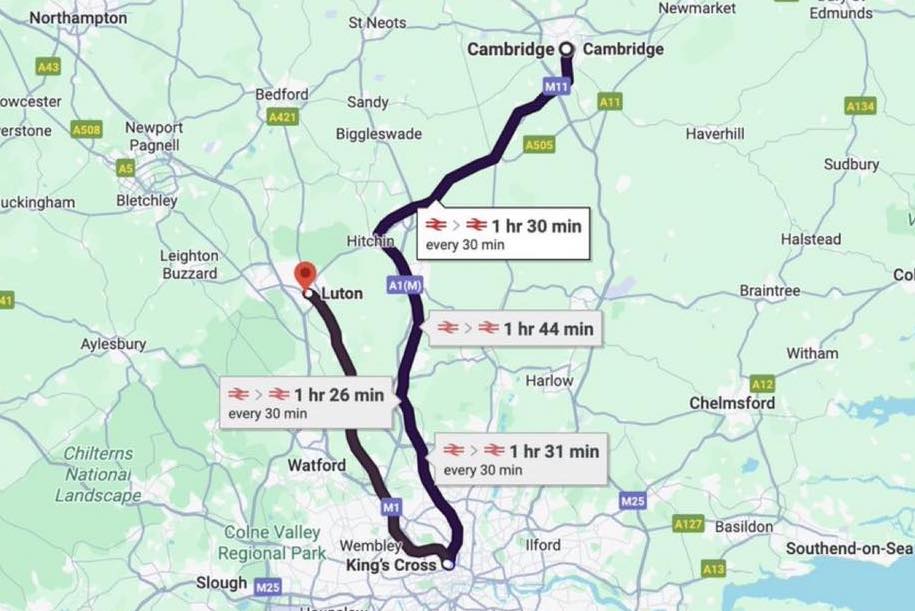 But the word "distance" comes up in many many other situations too. For example, if you're planning a train journey, you want to take the route that minimises the "distance" to your destination, where "distance" can mean any combination of time, money spent, comfort etc. This is genuinely different from just measuring the straight-line distance to your destination - behold, the train journey from Cambridge to Luton: